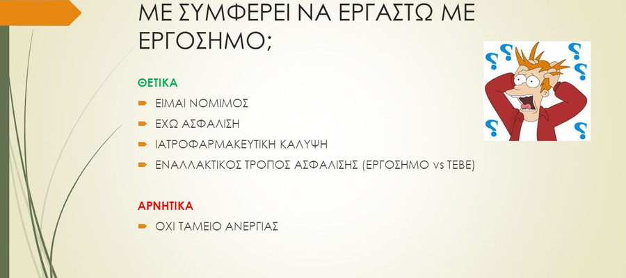► Από τα παραπάνω είναι εμφανές ότι οι εισφορές των απασχολούμενων οι οποίοι αμείβονταν με εργόσημο παραμένουν ίδιες και μετά την 1.1.2017. Επιπροσθέτως, οι διατάξεις του εργοσήμου δεν καταργούνται ούτε θίγονται με κάποια διάταξη του ν.4387/2016. Συνεπώς κατά την άποψή μας οι διατάξεις περί εργοσήμου εξακολουθούν να ισχύουν για όλους τους απασχολούμενους (σ.σ. πλην τωνεργατών γής)1 όπως αυτοί αναφέρονται στο άρθρο 20 του ν.3863/2010. Βέβαια, για ένα τόσο σημαντικό θέμα θα έπρεπε να έχει πάρει θέση το αρμόδιο υπουργείο έτσι ώστε να μην υπάρχει ασάφεια επί ενός τόσο σημαντικού θέματος που αφορά χιλιάδες πολίτες.